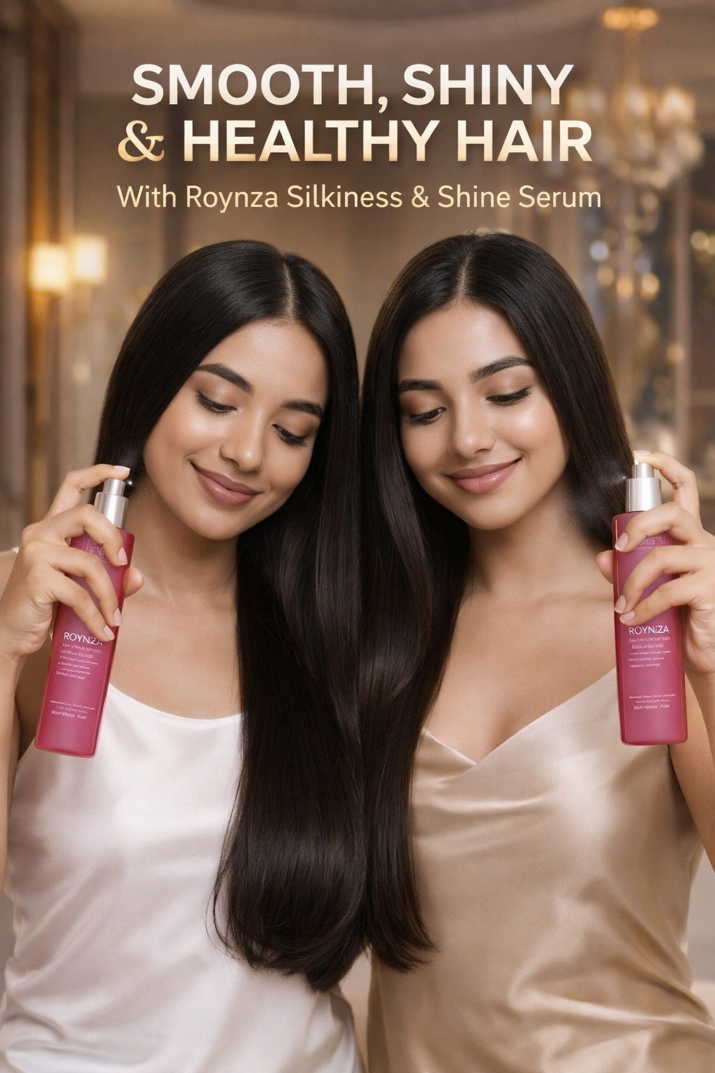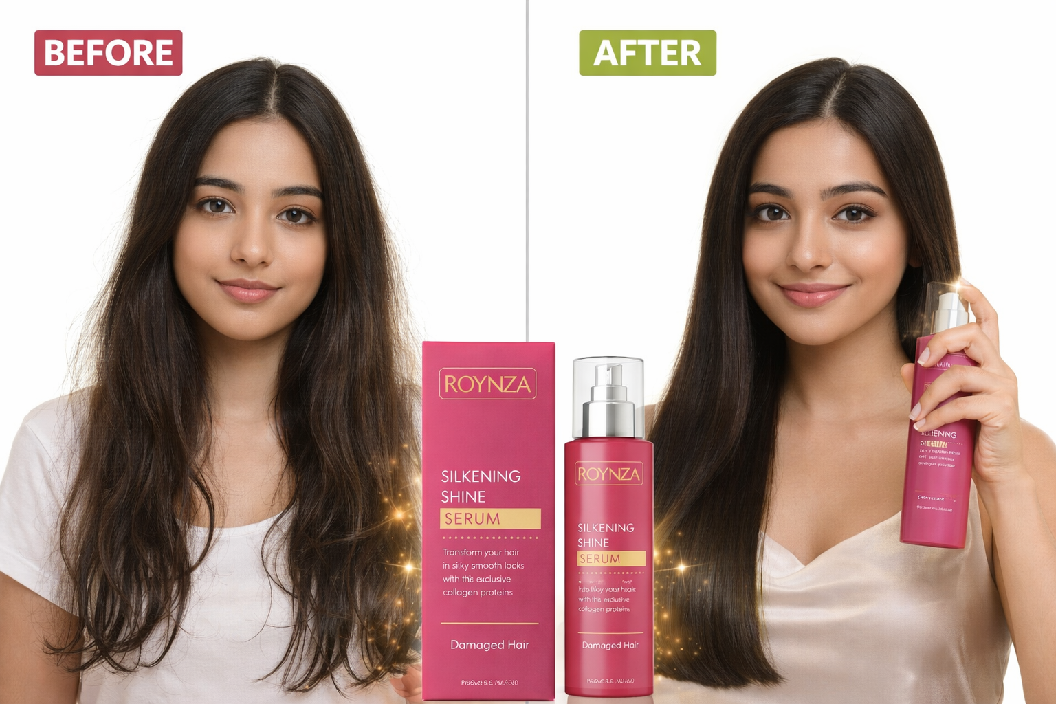 Roynza Silkiness & Shine Serum (100ml) – A nourishing hair serum formulated with collagen proteins to restore shine, smoothness, and softness to dry or damaged hair.
